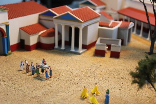 Durch aufwändige 3D-Druckverfahren wurde darüber hinaus ermöglicht, dass trotz des kleinen Maßstabs von 1:100 die Darstellung der kultischen Handlungen durch die Menschgruppen bis in feinste Details darstellbar wurde - Kleidung, Instrumente und Kultgegenstände, Körperhaltung bis in die Darstellung der Finger konnten so präzise umgesetzt werden. |